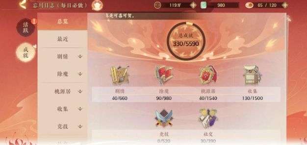 成就系统分类为剧情、除魔、桃源居、收集、竞技与社交。