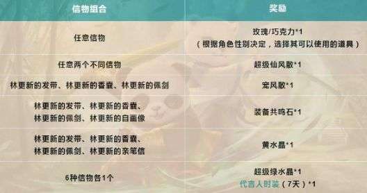 活动内容:活动期间玩家参与日常任务,可获得代言人林更新的相关信物。玩家可以使用收集到的信物兑换道具,不同数量的信物可以兑换不同的道具。