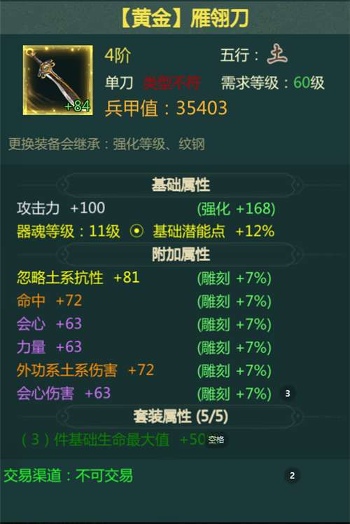 比如说你本身是土系职业,你有紫色单手刀武器兵甲值很高,五行也是正确的,但是它的词条全是格挡、体质;你有蓝色单手刀,兵甲值低一些,但是它的词条是力量、外功土系伤害等输出词条,这时候不要在意兵甲值高低,一定要带词条正确的武器。