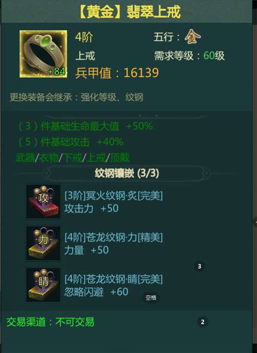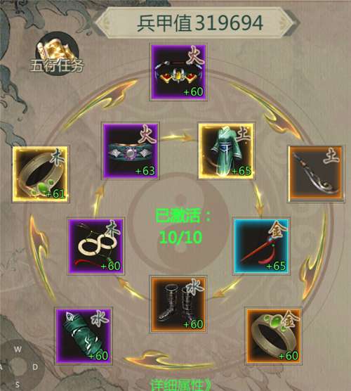 这里一定要提醒各位侠士,兵甲值高低不等同于实战能力,优先搭配好正确的装备五行,激活额外的附加属性,提升人物属性最大化,因此,哪怕为了激活装备五行,兵甲值略有降低,也是正确的做法。