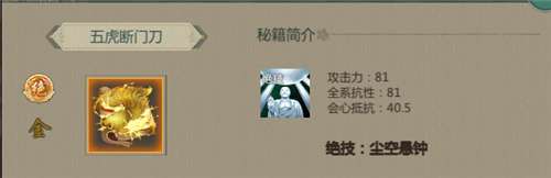 金色通用攻击力秘籍,效果为攻击力、全系抗性、抵抗眩晕效果,获取方式为秘籍抽取或者拍卖获得,未获得此秘籍可以使用《狮子吼》等紫色通用攻击力秘籍。