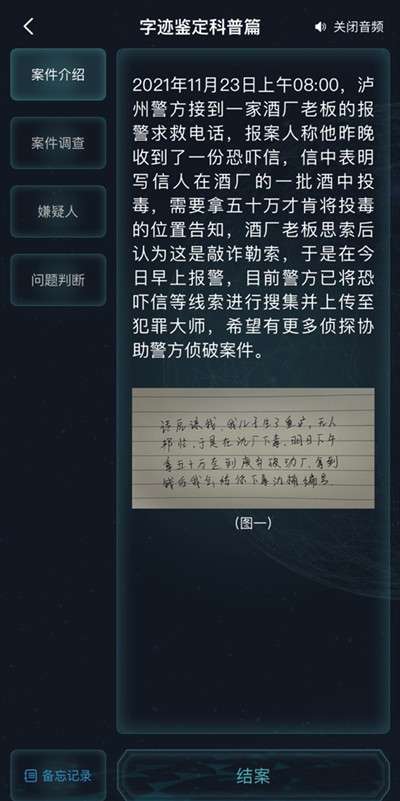 2021年11月23日上午08:00,泸州警方接到一家酒厂老板的报警求救电话,报案人称他昨晩收到了一份恐吓信,信中表明写信人在酒厂的一批酒中投毒,需要拿五十万才肯将投毒的位置告知,酒厂老板思索后认为这是敲诈勒索,于是在今日早上报警,目前警方已将恐吓信等线索进行搜集并上传至犯罪大师,希望有更多侦探协助警方侦破案件。