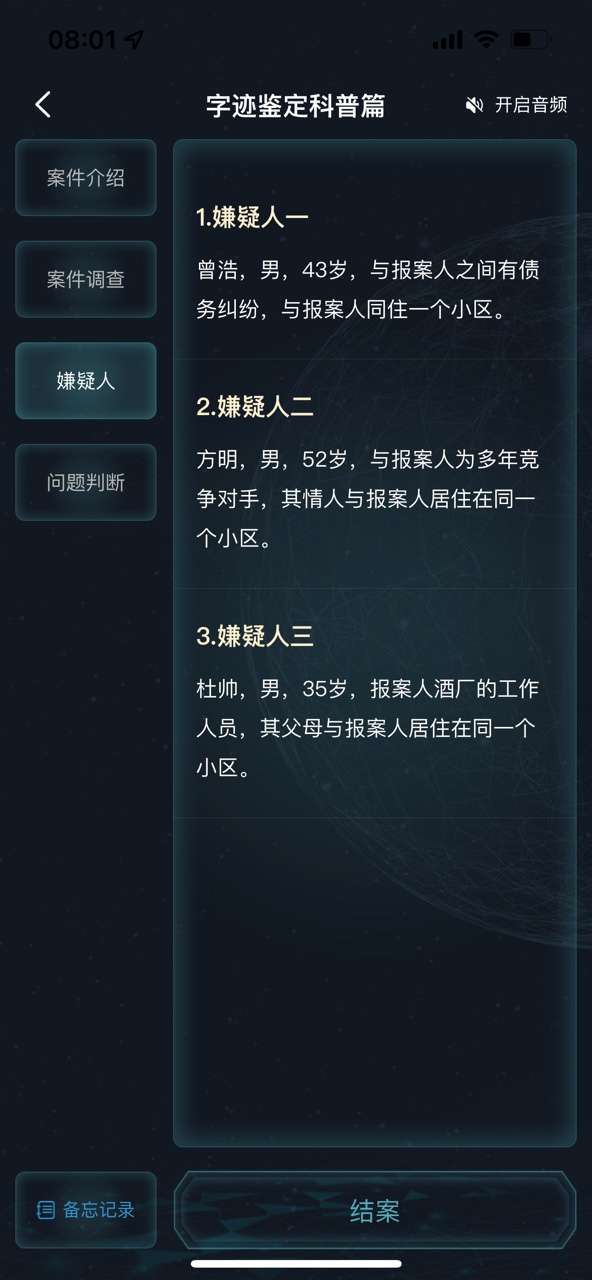 犯罪大师字迹鉴定科普篇来了,玩家根据线索来解析,去分析这个案件中问题的答案,需要去了解这个犯罪大师字迹鉴定科普篇答案是什么,需要大家在公布案件去了解真相。