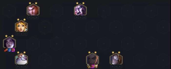从阵容、羁绊构成来看,由于有巨像英雄的存在这个阵容7张卡就可以成型(在8人口的情况),但是玩九五的体系,上9是非常关键的。上了9人口以后,尽量补一张额外的巨像牌去凑2巨像(赛恩最佳),然后阵容主要D出全场的2星5费卡,这样纯靠质量很容易吃鸡。