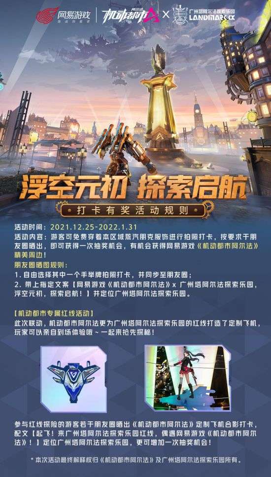 随着网易游戏漫画都市风机甲射击手游《机动都市阿尔法》S5赛季不断深入,“蒸汽航线”中最受玩家们关注的元初岛大地图,也即将上线。继前不久在深圳新沙天虹购物中心惊鸿一瞥后,这座迷雾中的飞岛将再次以一种更加特别的方式,让各位玩家提前感受浮空氛围!2021年12月25日-2022年1月31日,《机动都市阿尔法》联动广州塔阿尔法探索乐园活动正式开启!