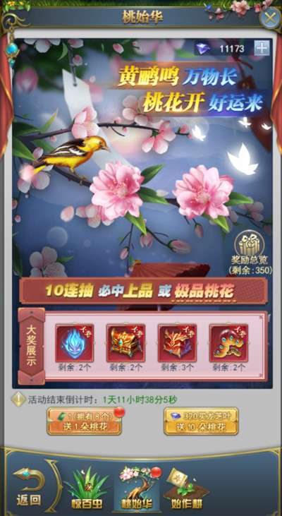 桃花有三种品质:极品桃花,上品桃花,普通桃花。十连抽必中极品桃花或上品桃花。