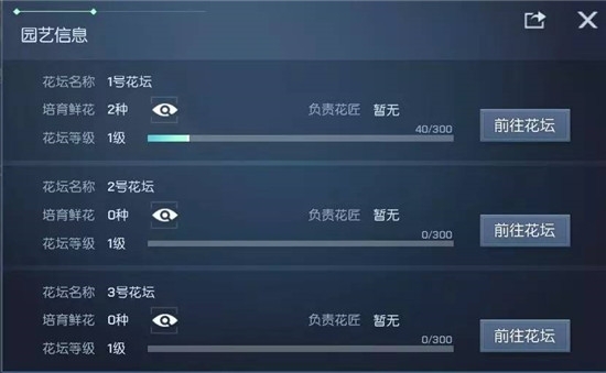 每个区域都有10块可种植鲜花的土壤,拥有园林花匠身份可在所属花坛区域进行培育、种植。会长也可消耗活力在任意花坛进行种植&铲除&打理鲜花,但不可以培育、采摘哟~