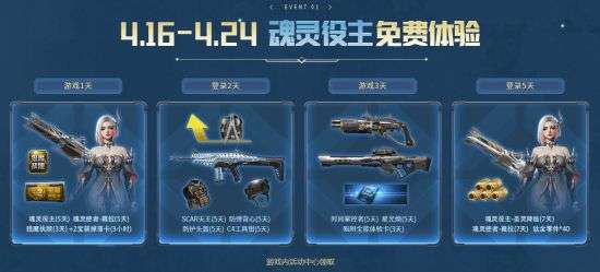 4月16日开始至4月24日,只要你游戏一天,即可领取魂灵役主(5天)、魂灵使者-薇拉(5天)、猎魔执照(3天)、+2宝箱掉落卡(3小时);