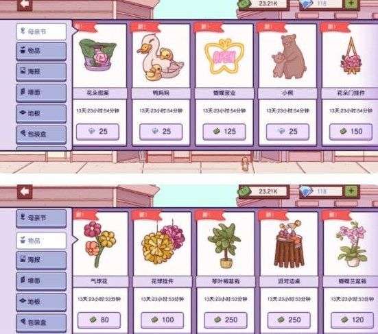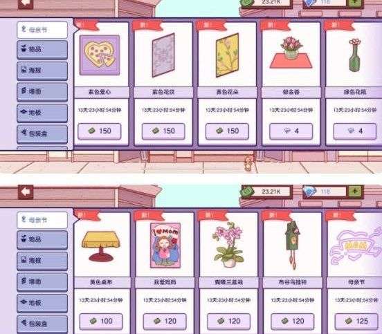 装饰物品合集,注:这次为了让大家看看价格先没买,有的已购买价格也会标注在下面:先是餐厅:金币:1310(母亲节选项),680(物品选项),150(郁金香壁纸),150(睡莲)钻石:83(母亲节选项),4(桌花盆栽),25(困困熊)以上花费金额可供参考??这次物品分散的比较散,所以个别单独的也就另外算了(图片里物品可能有重复)。