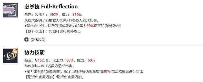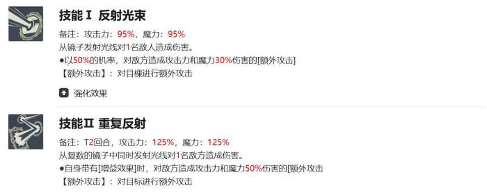 核心技能反射光线对单体造成95%魔攻伤害,50%概率追加30%伤害,不想看脸可以走魔力流,多放技能来弥补脸黑不触发的概率。多重反射消耗3回合CD,造成125%魔攻伤害,自身有buff时追加50%伤害,强化后附加22%暴击率。而全反射的AOE造成150%魔攻伤害,暴击时追加90%伤害。大家可以看出技能依赖反射与追加攻击,需暴击和buff触发最大化输出,没有成型暴击也就是会心的话,会极大的降低战力。