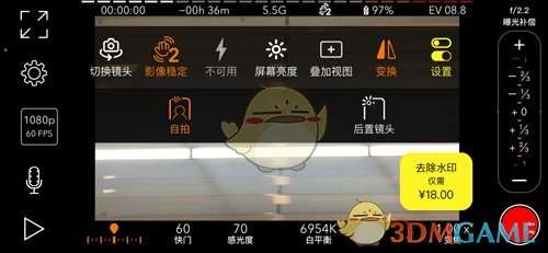 1、打开ProMovie安卓app之后,我们可以看到一个非常简洁干净的页面,基本上你们能看到的所有内容就是软件中的所有的内容啦!我们如果想要切换摄像头的话,点击左边的【设置图案】,这个时候我们就可以看到一个【切换镜头】,点击之后我们可以看到直接显示【自拍】,我们就点击【自拍】就可以了。
