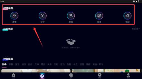 3、进入编辑页面可使用滤镜、文字添加等功能处理视频素材。