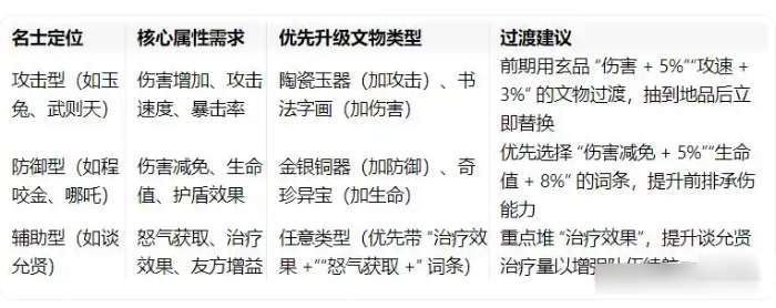 每位名士可携带 4 件文物,文物分天、地、玄、黄 4 个品阶,仅地品、天品文物有 “特殊属性词条”,玄品、黄品仅作过渡,无需过多投入资源。