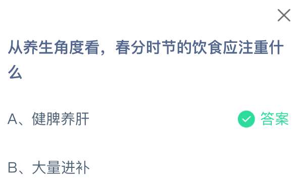 从养生角度看,春分时节的饮食应注重什么?支付宝小鸡课堂开课啦!每天只需花一分钟,动动手指答对问题,180g饲料立马到账!看着自家小鸡吃得饱饱的,还能顺便捐个爱心,一举两得!2026年3月20日蚂蚁庄园的小鸡课堂题目正确答案是【健脾养肝】,从养生角度看,春分时节的饮食应注重健脾养肝。