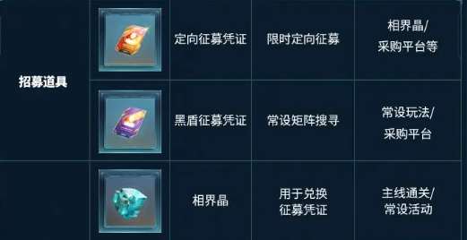先来看一下核心的招募道具,如果想要抽取强力的角色,那不能缺少的就是黑盾征募,还有定向招募。定向征募凭证凭证是限时间的,主要就是通过采购平台去兑换,在赶上活动时就应该选择多囤积。黑盾征募凭证相对来说是比较常用的,常设的玩法通关之后就可以拿采购平台也可以兑换。在积攒足够之后就可以设矩阵去搜寻抽卡,并不需要去等待限时活动。日常的活动每天都可以刷,只需要花10分钟就可以清理完毕。