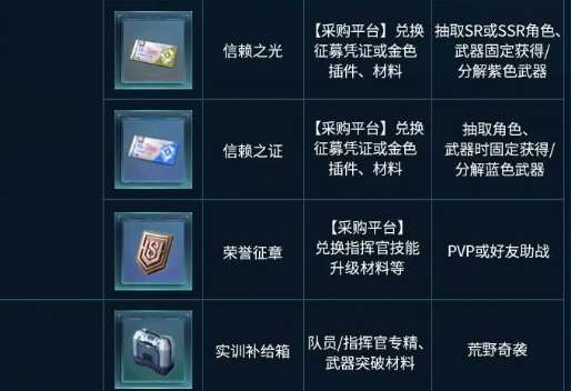 武器与模组养成道具也可以盯着武器兑换币,还有模组数据单元,主要就是靠深红武装副本。深红武装每一周打三次,不仅可以获得两个道具,并且还可以出活性合金锻料。这可就是医疗还有工程专精再提升的关键材料,必须要优先去刷满。还有专精以及突破材料,不同职业的队员所需要对应的材料也是有所区别的,千万不要搞混了。实训补给箱,还有实训仪都可以通过打副本拿到,队员以及指挥官战术专精的突破全部都会靠他。