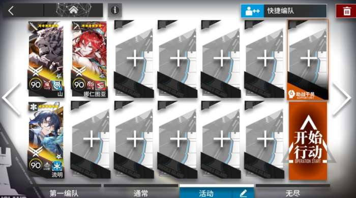 依次部署山挂机。下面是前几关通用配置,上场其中1-3人即可。