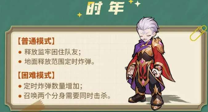 时年这个BOSS算是比较复杂的了。它有个很讨厌的技能就是会释放监牢把队友关起来,被关住的人就不能动了。同时它还会在地上放定时炸弹,过一会儿就会爆炸。困难难度的时候,定时炸弹数量会增加。更麻烦的是它还会召唤两个分身出来,这两个分身必须同时击杀才行。打这个BOSS要注意几个地方,首先看到队友被监牢关住了要赶紧打破监牢救人。地上的定时炸弹也要躲开,看到预警就走。