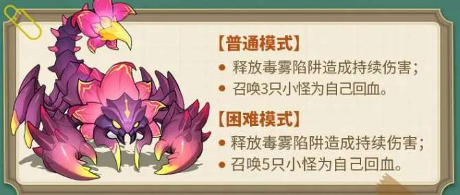 粉红娘娘这个BOSS机制就比较特殊了。它会在地上释放毒雾陷阱,踩上去就会持续掉血。而且它还会召唤小怪来给自己回血,普通难度召唤3只,困难难度召唤5只。这个BOSS打起来要注意两点第一是别踩到地上的毒雾,不然血掉得很快。第二是小怪一出现就要马上打掉,不能让它们给BOSS回血,不然会拖很久。