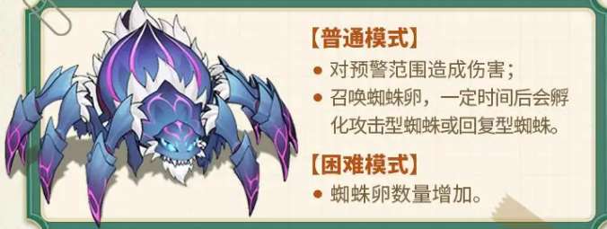 先说人面魔蛛这个BOSS。普通难度的时候,它会在地上出现一些预警区域,然后对这些区域造成伤害。同时还会召唤蜘蛛卵出来,这些卵过一会儿就会孵化成蜘蛛。孵化出来的蜘蛛有两种,一种是攻击型的会打人,另一种是回复型的会给BOSS加血。到了困难难度,蜘蛛卵的数量会变多,压力就更大了。打这个BOSS的时候要注意看地上的预警标记,提前走开就不会被打到。另外看到蜘蛛卵出现就赶紧打掉,不然等它孵化出来就麻烦了,特别是那种会给BOSS回血的蜘蛛。