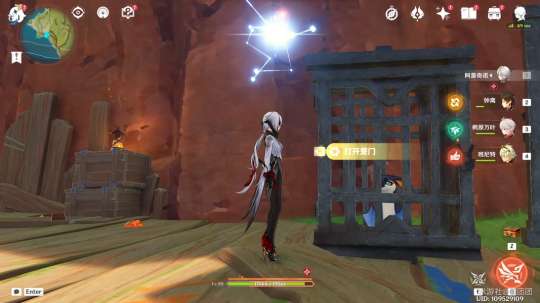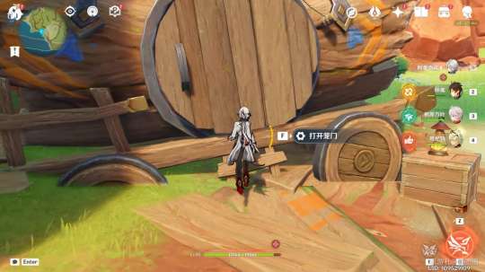 然后来到旁边的木车处打开圆木门。