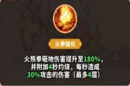 火熊拳砸地伤害提升至180%,并附加4秒灼烧,每秒造成30%攻击的伤害(最多4层)