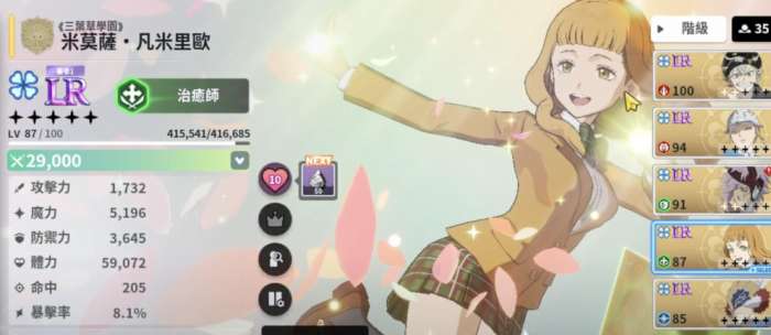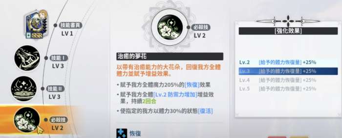 并且使用大招的时候她恢复的数值是非常高的,同时还会对一些血量比较低的队员再次带来一些额外的治疗效果,所以如果是大家遇到即将团灭的情况下,使用这个技能是可以达到很强的拉回效果的,在实战当中她还可以给全体的角色都带来防御力增加的增益,不过这个技能是需要米莫萨提升了自身品质之后,才可以带来的必杀技效果,而且还可以使指定的我方角色在体力30%的时候,自身状态达到一定之后还可以用到复活技能,这个复活的效果则是这个必杀技最强的效果。