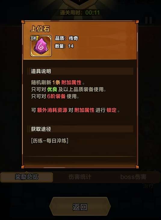 挑好要用的技能词条后,玩家也将正式开始战斗。本玩法的目标很简单,那就是将boss击败即可,但要注意挑战时限只有5分钟,所以对角色的练度有着较高的要求,最好将天赋、技能等都搭配到角色当前最强的状态后,再去尝试挑战本玩法。挑战成功后便能立刻拿到掉落的上位石和下位石,随即便可直接在装备洗练中使用,并且挑战所花时长不会对资源掉落的数量产生影响,只要在5分钟内完成就能领到全部的奖励。反之,若是挑战中被boss击败,亦或没能在时间内完成,则都视为视为,没有任何的奖励。