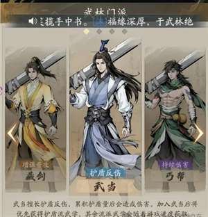 游戏里总共有四大门派,分别是以护盾反伤为主的武当派、持续伤害的丐帮、增强普工的藏剑以及残血爆发的明教。
