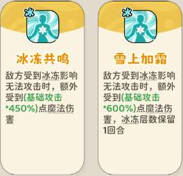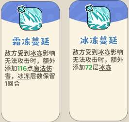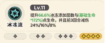 冰冻流是主打控制,伤害也不低,打冒险很强的流派。冰冻效果是每回合开始时有冰冻层数/(冰冻层数+150)的概率无法普通攻击,之后层数降低(5+0.4*冰冻层数)。流派升星后提升冰冻添加层数和生命,并前三回合还有减伤。