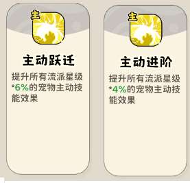 主动流是最强辅助流派,让宠物的技能释放的更频繁,最多一回合一个宠物可以释放5次技能,当然5次比较困难,但每回合2次还是很容易的。而没有主动流的情况下,可能要四回合左右才能释放一次技能。主动流是将宠物技能功能利用最大化的流派。流派升星后提升宠物技能效果和生命。