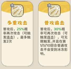 ①多重攻击,流派30级后升级为普攻追击。核心技能,伤害翻倍,升级后存在无限可能。