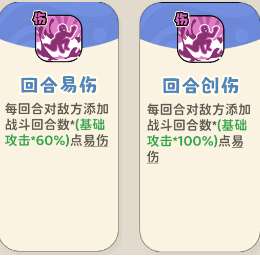 ①回合伤害,流派30级后升级为回合重伤。核心技能,增加攻击频率,基础数值不高,主要触发易伤效果。