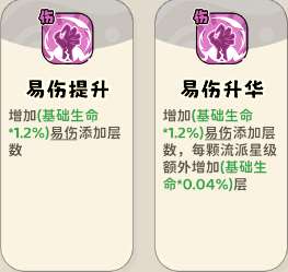 易伤流是辅助输出流派。易伤效果是每次造成伤害后每层易伤额外增加一点伤害,之后层数降低(5+0.4*易伤层数)。相当于一点易伤两点伤害,与护盾流互相克制。流派升星后提升易伤添加层数和生命。
