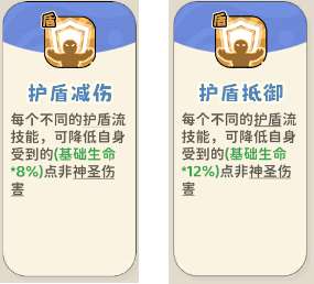 ③护盾减伤,流派7级后升级为护盾抵御。核心减伤技能。最高可以有16个护盾技能,直接每次减伤19.2%基础生命的伤害,不是我算错了,是描述错误,笑死。