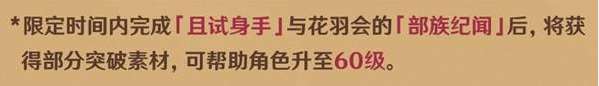限时完成花羽会的「部族纪闻」和且试身手,即可直接获得恰斯卡直升60级的突破材料!