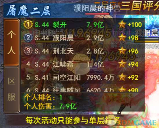 小编这里帮大家简单总结一下:活动分为四层,每一层的开启时间与开服时间和三国评分相对应,并且每次活动开启时只能选择其中一层进入,每层地图有一个伤害排行榜,勇士们的伤害数据和排名都会在排行榜中展现,排名越高的玩家可以获得更好的个人排名奖励,排名越高的区服可以获得更好的区服排名奖励。所以,为了个人和区服的荣耀、为了更好更棒的奖励,勇士们一定要拿出200%的努力和热血!
