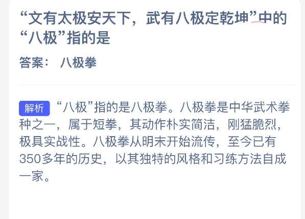 以上就是“文有太极安天下,武有八极定乾坤”中的“八极”指的是?支付宝蚂蚁新村最新答案2025年12月13日,更多精彩内容,请点击关注pk游戏网更新!