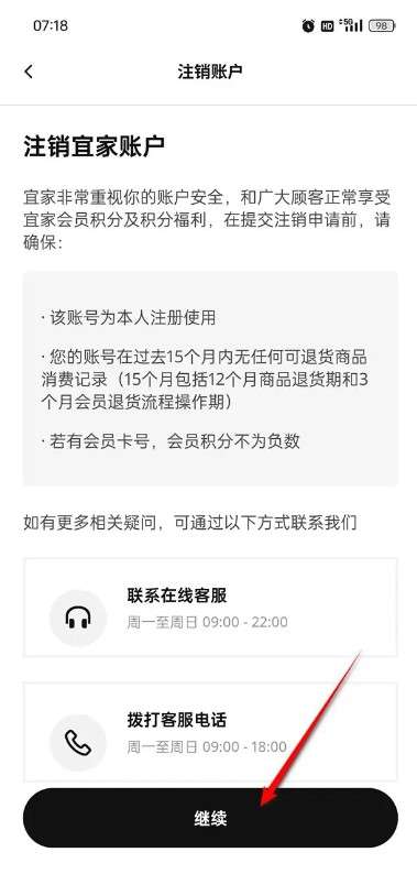 点击“继续”即可前往注销宜家账户了。