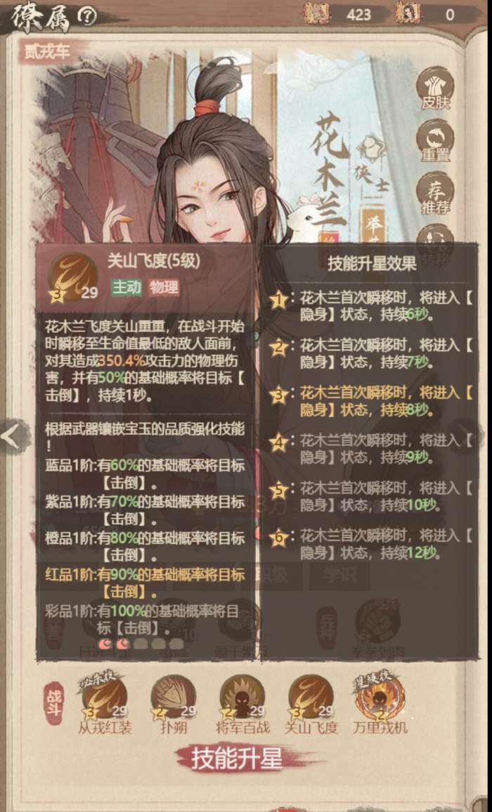 切后核心** 开局瞬移至敌方血最少单位,造成240%物攻,彩1阶100%击倒1秒;首次瞬移后获得12秒隐身,完美规避开局伤害。这是花木兰的核心切入技能,直接决定“开局能否秒脆”,优先级最高。
