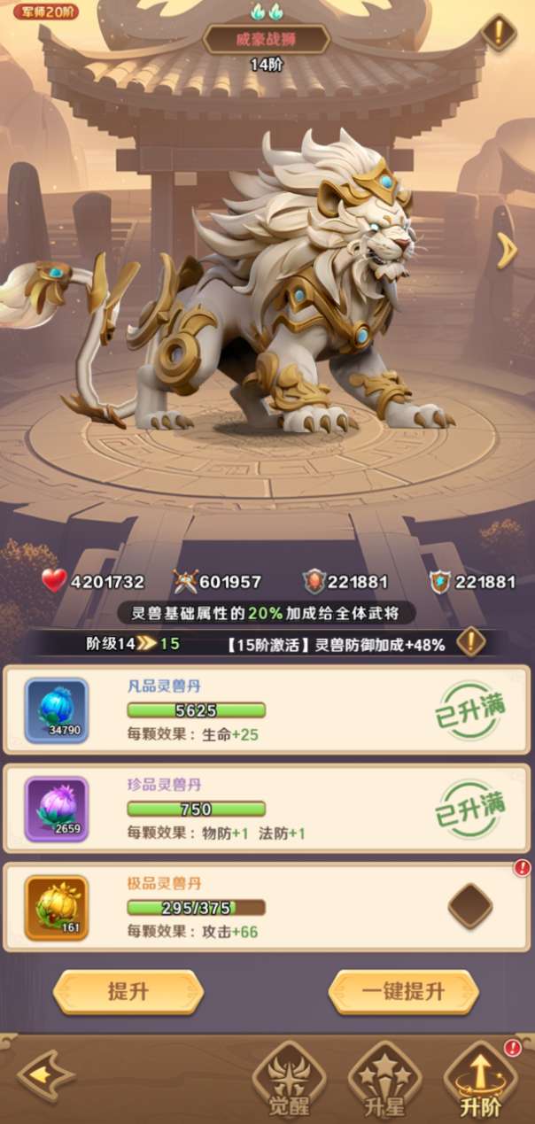 豪威战狮:在游戏前期的时候,玩家倒是可以选择这只灵兽,因为它作为全能型的输出类型的灵兽。在战斗的时候,它可以直击战斗核心的痛点,一旦施展技能之后,就可以给整个武将提供怒气值的加成。额外也可以让伤害,暴击率以及爆伤等等方面的提升。其实对于他的出现,往往能够让整个队伍的实力增强。不过对于玩家来说,在资源分配方面的话,可以直接将豪威战狮提升到6星,然后就能够解锁被动技能,再合理的运用它。