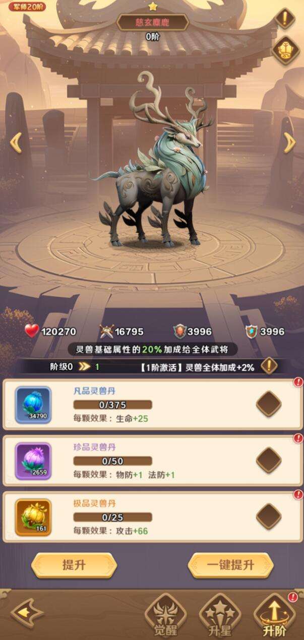 玄慈麋鹿:在游戏前期的时候,它能够构建成最强的防御体系。另外,玩家如果资源有限的情况下,倒是可以长时间的培养,毕竟他的实力也是比较强悍的。其实对于玩家来说,他每回合开始的时候就能够给自己的队友吸收能量,从而让自己提高15%的护盾。另外他还能够让自己队伍有30%的概率触发复活的情况。不过玩家这时候也需要注意,要合理的搭配,并且也是要根据自身的资源以及情况,选择合适的灵兽进行培养。