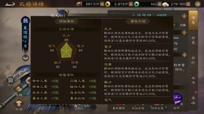 从五维看 武力值属于T0级别,统率决定防御属于T1级别,毅力不低决定法防也属于T1级别,运气值66决定了夏侯惇的暴击率不高,并且升阶、兵书提升的暴击并不多,他的技能和大招几乎都依赖连击几率。