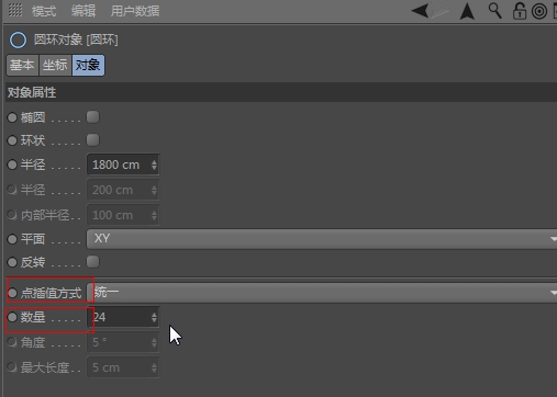 1、启动软件,点击自由样条工具组,在工具组内选择圆形样条,此时新建成功一个圆形样条,在属性栏将半径更改为1800cm,将点值方式设为统一,数量更改成24;