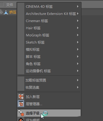 2、打开细分曲面工具组,在弹出的窗口中选择挤压命令,把刚才建立的样条拖动到挤压图层下面,使圆形样条生成厚度,选中挤压图层,在属性面板中将移动属性第三个数值改为200;