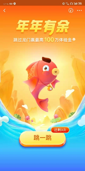 2、在年年有余的页面上点击下面的“跳一跳”。在倒计时时间内,通过持续点击光标按钮,让小鱼向上跳起,跳过龙后就机会获得奖品,一般是获得体验金;