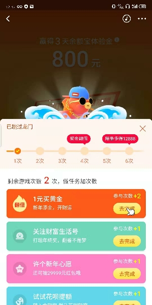 4、想要获得更多的跳一跳机会的方式有很多,比如1元买黄金、关注财富生活号、许个新年心愿、花呗提额等;