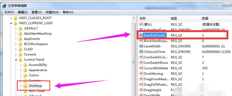 2、在注册表编辑器页面展开到“HKEY_CURRENT_USER/Control panel/Desktop”