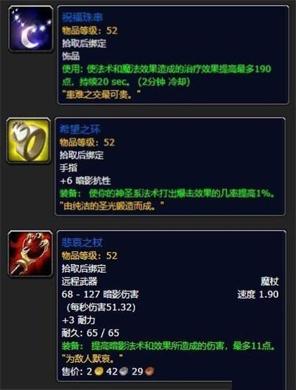,牧师毫无疑问选择祝福珠串,你可以把它当做是治疗版本的短暂能量护符。其余两个饰品的作用比较一般,不做比较。