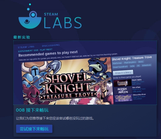 感兴趣的玩家可以尝试一下Steam实验室新功能“接下来畅玩”,或许从今天开始,一些玩家的“选择困难症”就会得到缓解,而库存积压的游戏也会越来越少。